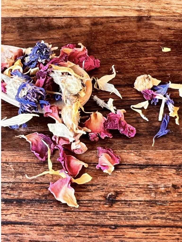 Skład: Płatki róż, płatki nagietka, płatki chabra czerwone i niebieskie.